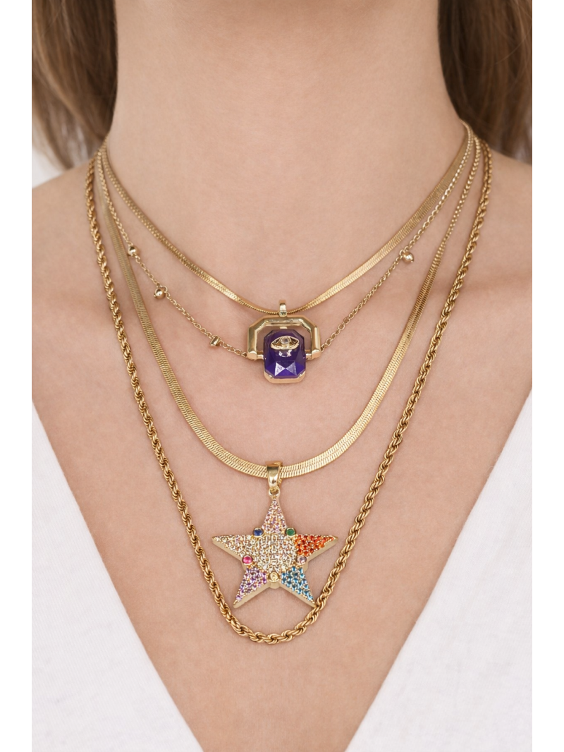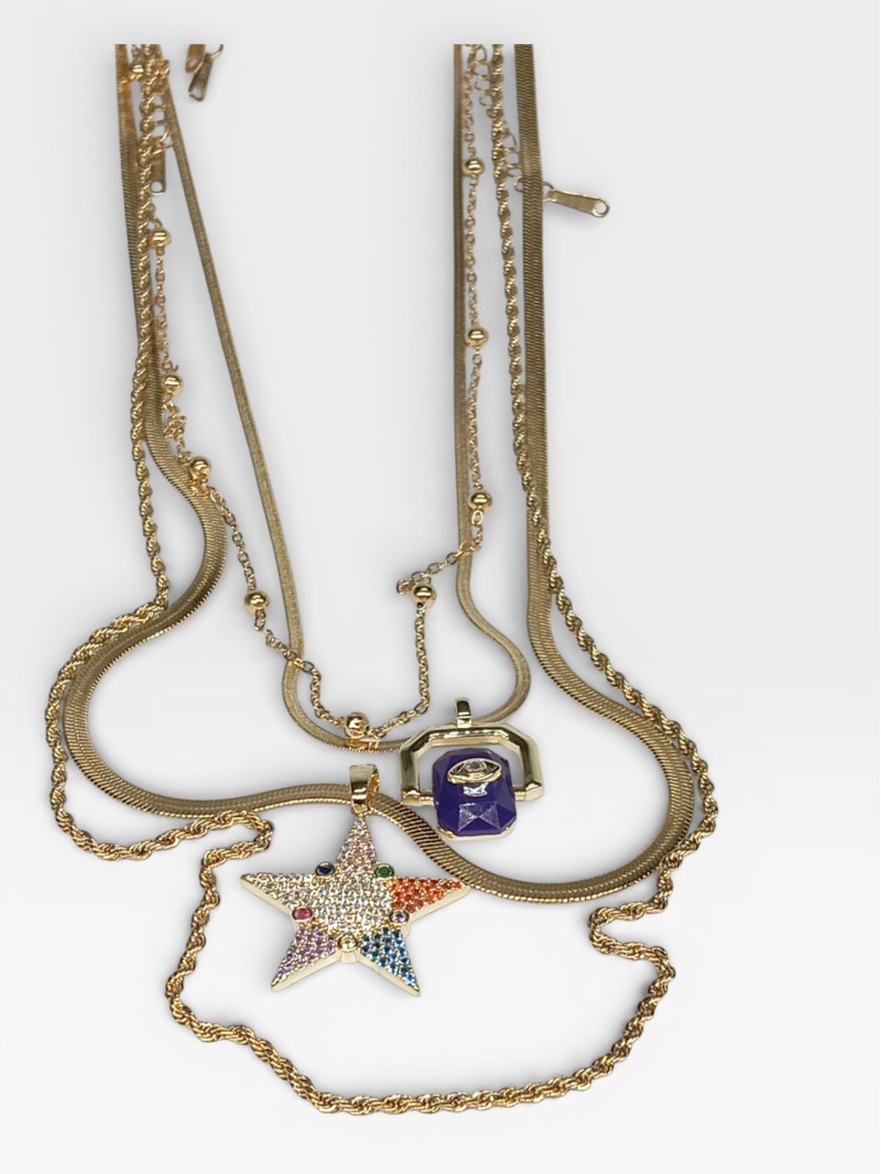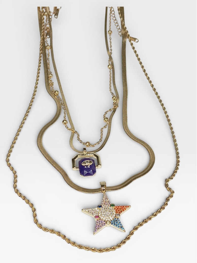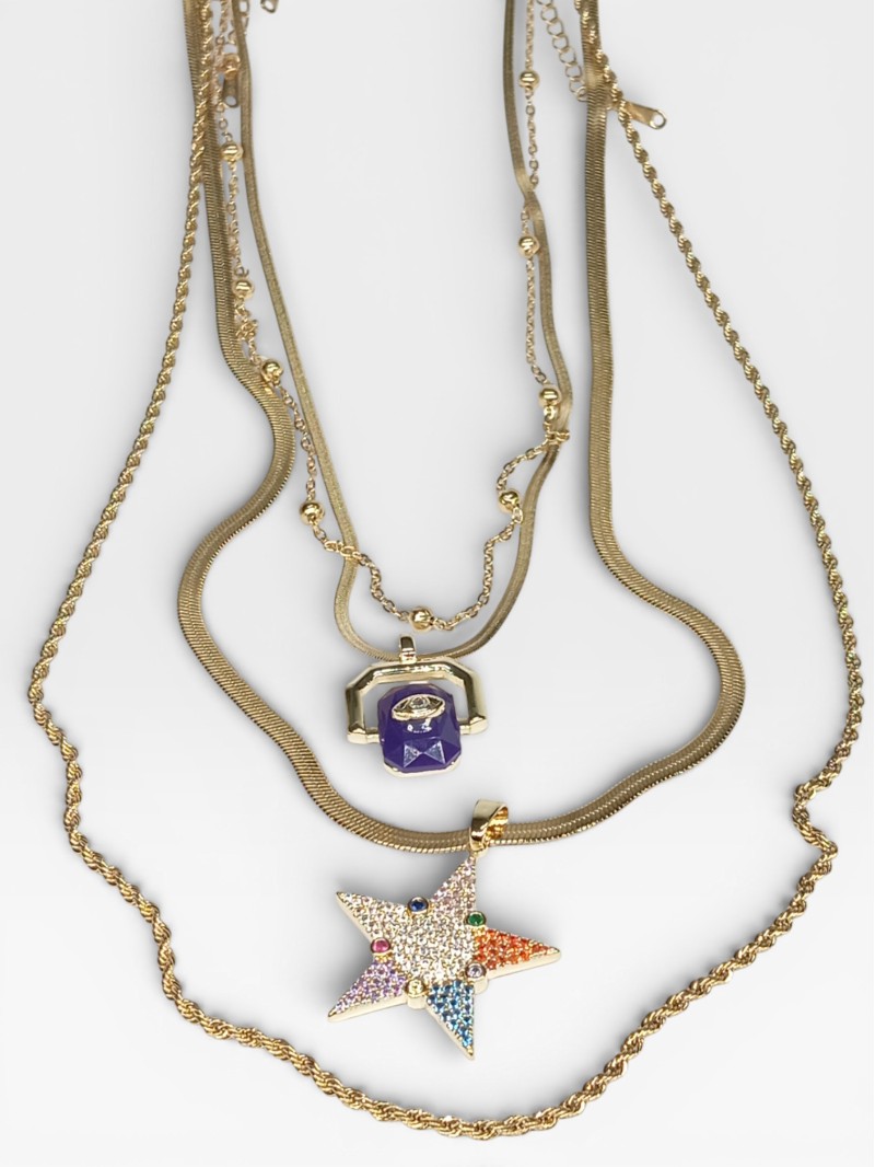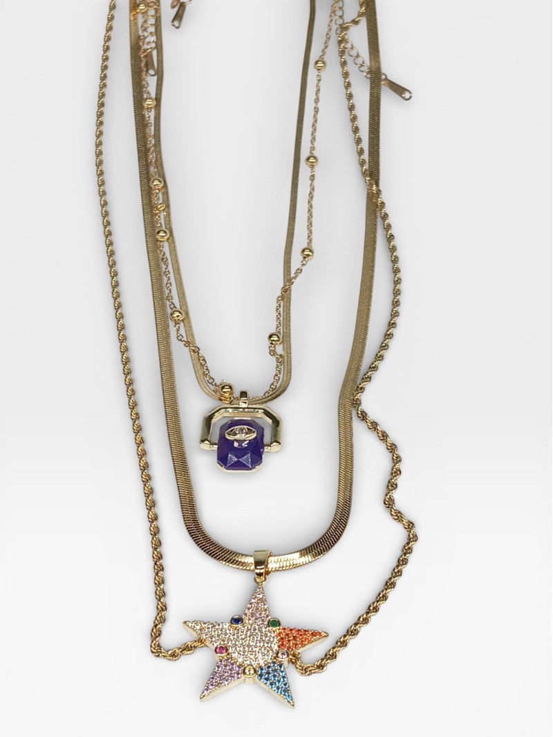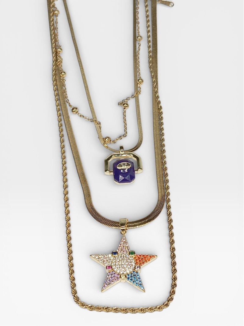 Yıldız figürlü renkli taşlı kolye, baget taş detaylı kolye ve farklı zincir yapıları sayesinde günlük kullanımdan özel gün kombinlerine kadar geniş bir kullanım alanı sunar.