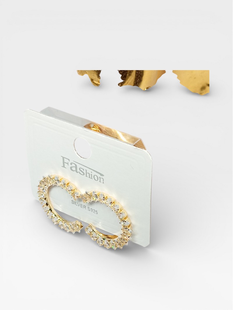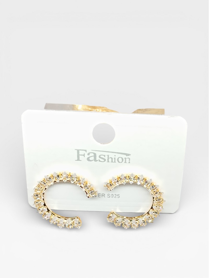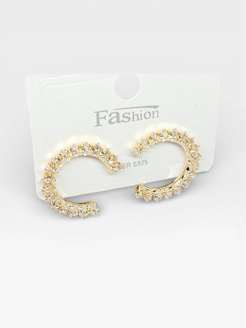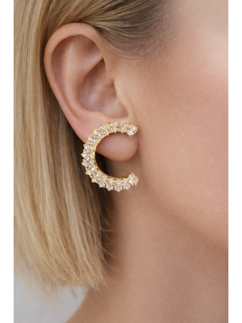 Parlak zirkon taşlarla çevrelenmiş C form tasarımı, kulağı estetik şekilde sararak tek küpeyle bile güçlü bir stil sunar.